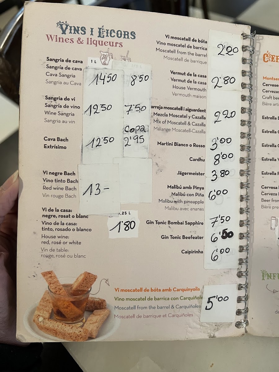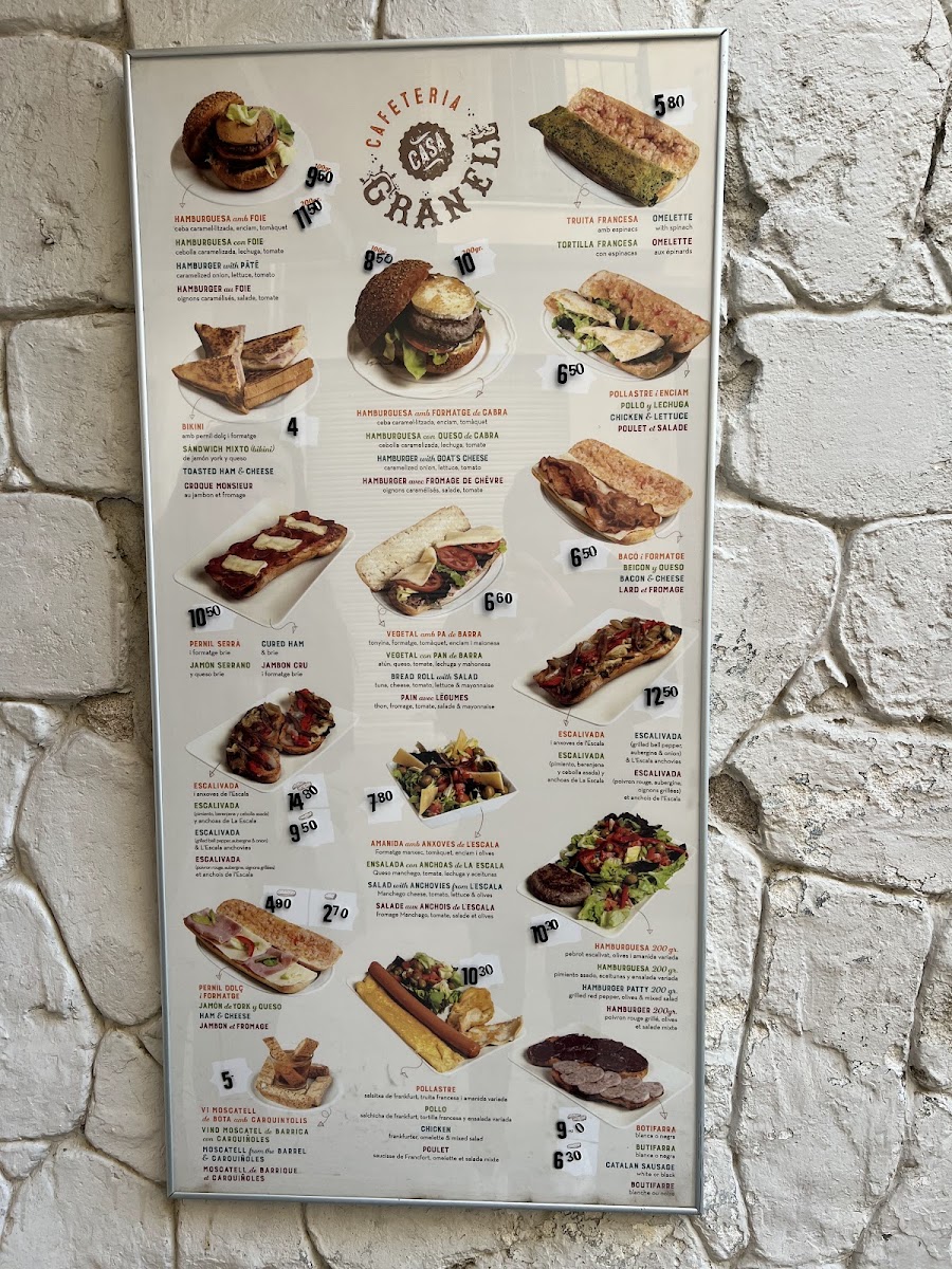The menu at Cafetería Casa Granell offers a delightful selection of dishes, ranging from hearty hamburgers to light tapas, all at affordable prices. Their hamburgers come in various sizes and with different cheese options, such as 100 gr. with Havarti cheese and 200 gr. with goat cheese. For a more indulgent option, you can try the 100 gr. with foie. The entrepans calents (hot sandwiches) feature classic choices like Truita francesa and Pepito de vedella, while the entrepans freds (cold sandwiches) include favorites such as Xoriço and Mini de fuet. The pa de coca section offers flavorful combinations like Pernil serrà and Pollastre, while the torrada amb pa de pagès presents delicious options with Formatge manxec or Butifarra. For a more filling meal, the plats combinats menu includes choices like Llom, Pollastre, and a generous 200 gr. Hamburguesa. Salad lovers can enjoy the Tonyina or Anxoves de l'Escala salads. If you're in the mood for some tapas, the Anxoves de L'Escala and Formatge manxec en oli d'oliva are great choices. To complement your meal, the drink selection features a variety of craft beers from Montseny, along with classic Estrella Damm and Estrella Galicia beers. Refreshments include natural orange juice and sparkling water, and for a special treat, you can try their Sangria de cava or Cava Bach Extrísimo. This menu, with its diverse offerings, provides something for every taste and occasion.